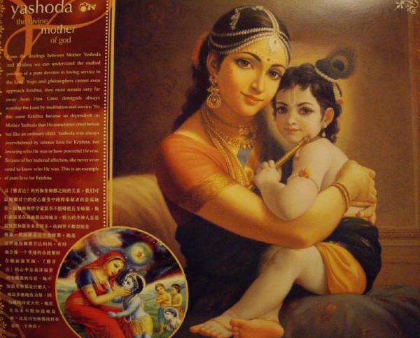 從「雅首達」媽媽和奎師那之間的關係,我們可以理解對主的愛心服務中純粹奉獻者的崇高地位。瑜伽師和哲學家甚至不能夠接近奎師那,他們必須待在離祂很遠的地方。偉大的半神人總是以冥想和服務來崇拜主。連閻羅王都害怕奎師那。然而就是這個奎師那,祂是這樣地依賴雅首達媽媽,有時後會像一個普通的小孩那樣在她面前哭鬧。「雅首達」的心中總是洋溢著對奎師那的母愛,她不知道奎師那是什麼人,祂是多麼地有力量。因為她的母愛天性,她甚至從來不想知道祂是誰。這是對奎師那純粹奉愛的一個典範。 |